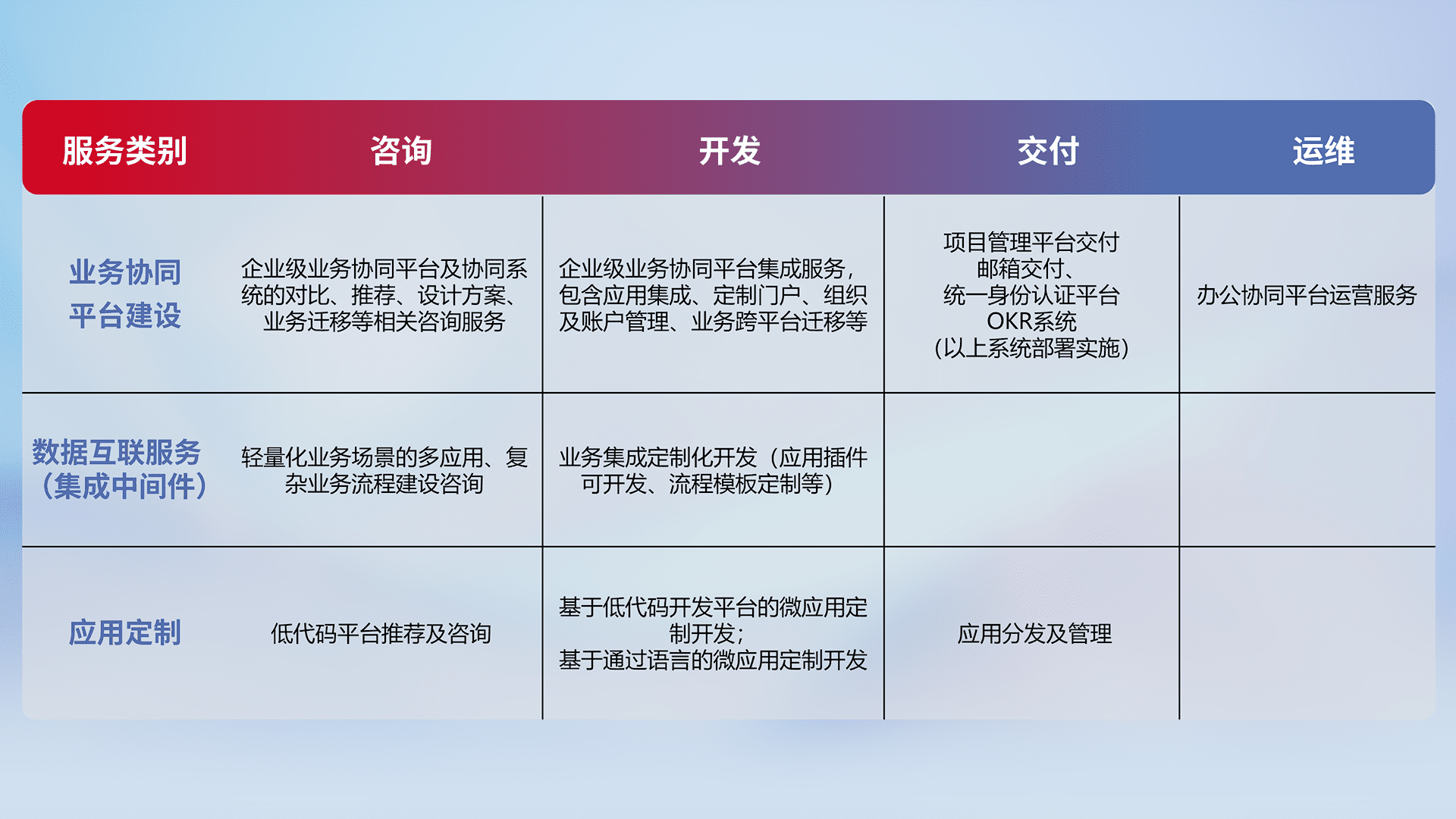 针对钉钉、、企微、、、IDaas等平台级产品提供产品的规划、、、、方案、、交付、、定制化开发等服务,,,实现如统一协同办公、、、智能客户服务、、、混合会议管理、、、智能数据查询、、等业务场景,,,,实现数字化转型。。